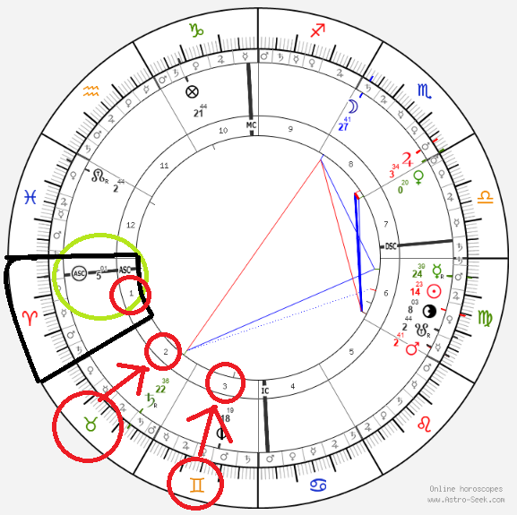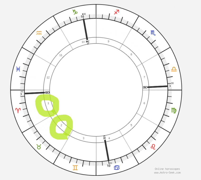 라임색으로 동그라미 친 ASC라는 선을 찾아주세요. 그 선을 감싸는 바깥쪽 피자 조각(1번 영역)에 양자리 기호가 보입니다. 검은색 선으로 표시한 이 1번 공간이 바로 1하우스이며, 이 차트의 주인이 태어난 곳이자 '나 자신'을 나타내는 가장 중요한 공간입니다.