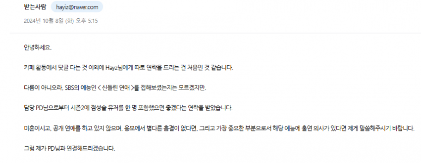 가장 큰 영향을 주는 행성이 금성(사랑, 연애, 오컬트)이었던 2024년 10월, 저는 점성술 카페 매니저님을 통해 메일 한 통을 받게 됩니다. SBS 방송국의 **<신들린 연애 시즌 2>**에 출연할 의향이 있냐는 섭외 연락이었습니다.