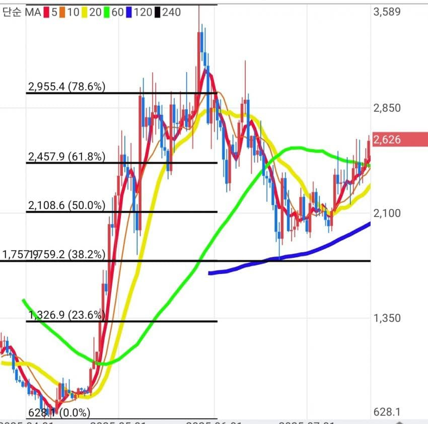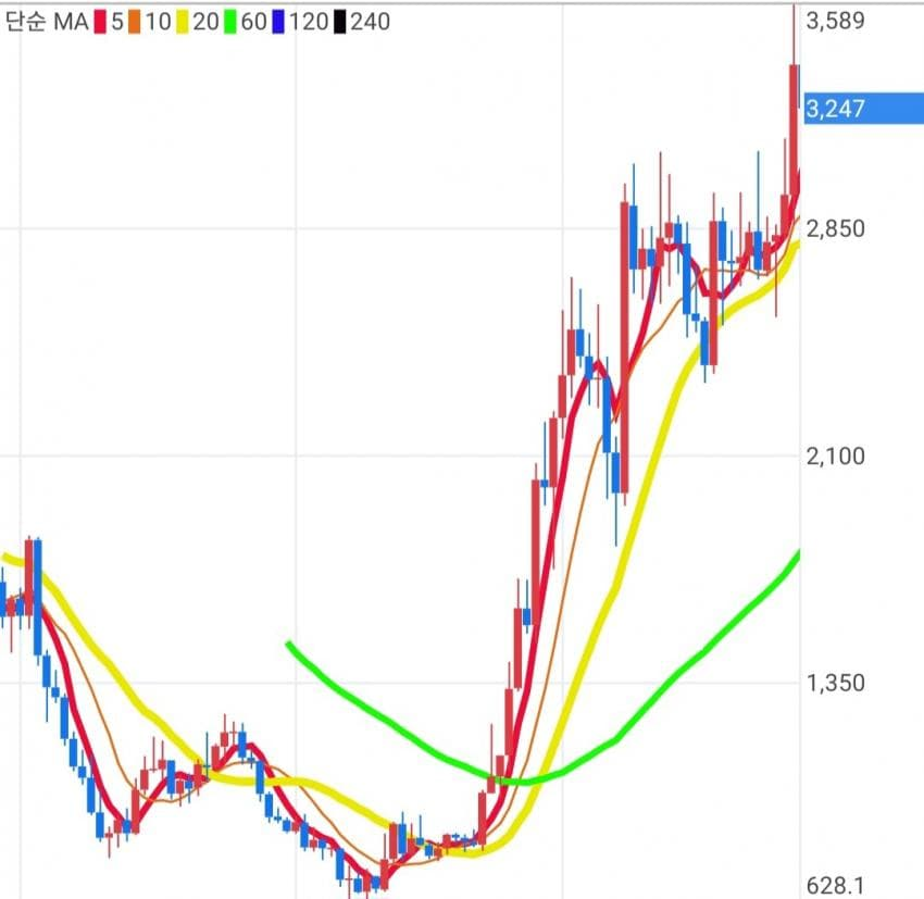 628원에서 시작된 가격이 3,589원이라는 최고점을 찍고 3,000원, 2,500원, 2,000원으로 계속 하락합니다. 사람들의 생각은 제각각이겠지만, 전체적으로 사람들의 심리가 "어? 이 정도면 싼데? 다시 사볼까?" 하고 돌아서는 마법의 구간이 있습니다.